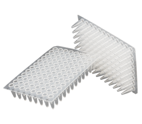 96-well, non-skirted PCR plate with easy-to-read alphanumeric labels. Rimmed wells minimize cross contamination. Capacity is 200 µl per well.