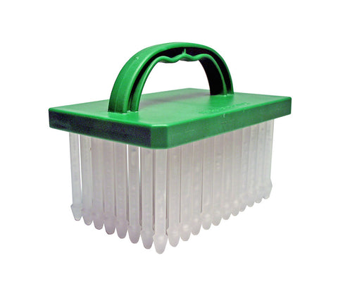 The Squisher-96 features durable polypropylene construction and, although disposable, can be cleaned and reused to homogenize up to 96 small samples of tissue simultaneously in preparation for DNA, RNA, or protein extraction and purification. Works well with liver and brain tissue as well as small insects. Comes with 96-well deep well blocks for efficient processing and sample recovery.